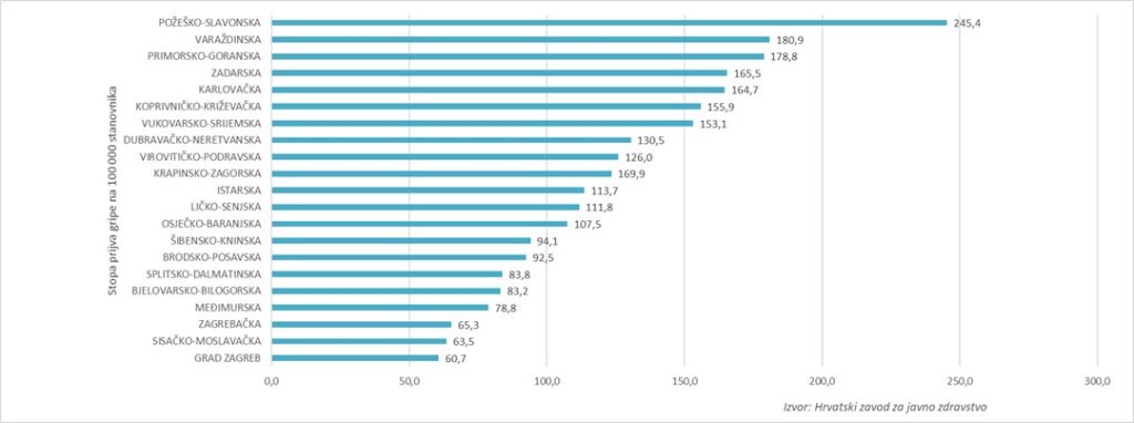 Prijave gripe zaprimljene su iz svih županija, pri čemu se u 1. tjednu najveća stopa prijava gripe na 100 000 stanovnika bilježi u Požeško-slavonskoj županiji. Među pristiglim prijavama gripe stopa incidencije je uobičajeno najveća u djece predškolske i školske dobi, a najniža u osoba u dobi od 65 godina i više.