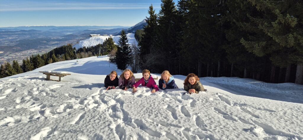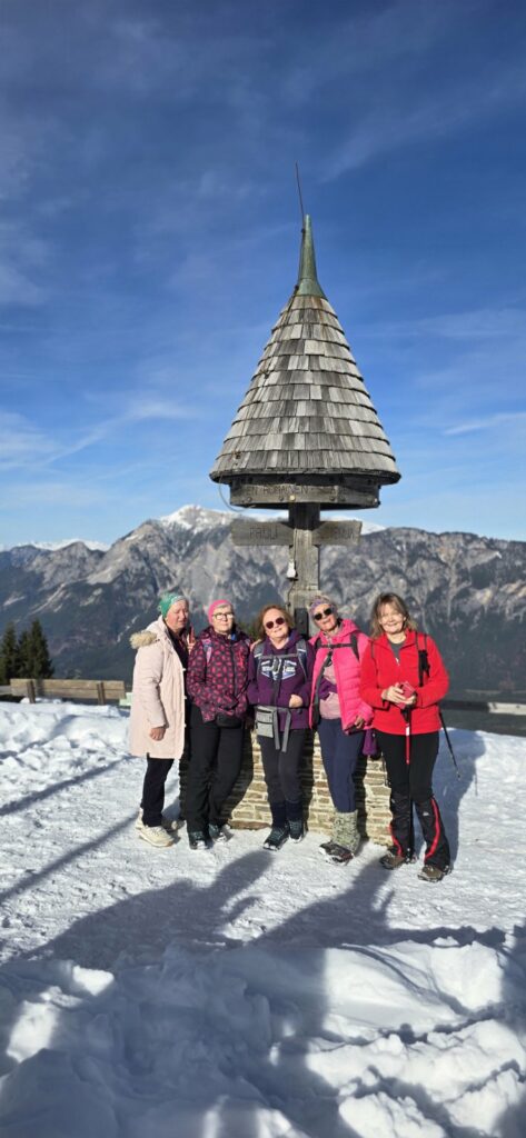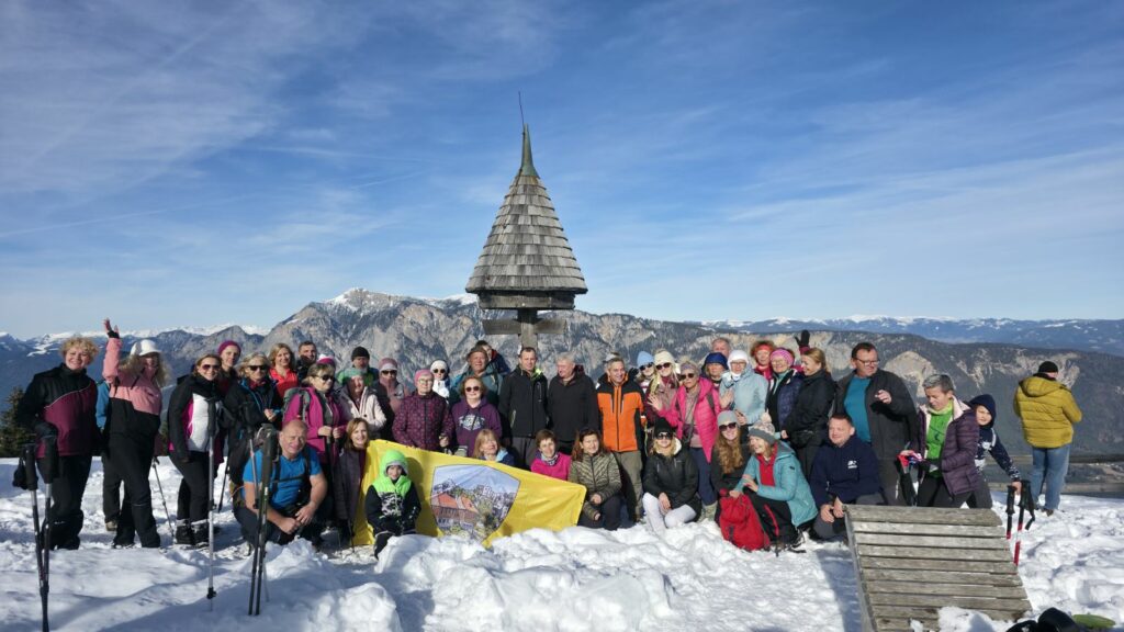 Na vrhu – prekrasan pogled na Julijske Alpe, Karavanke, Kanalsku dolinu i pola Europe. Kažu da se vidi čak i Venecija… ali mi smo se više fokusirali na fotkanje i dokazivanje tko je zapravo prvi stigao na vrh.