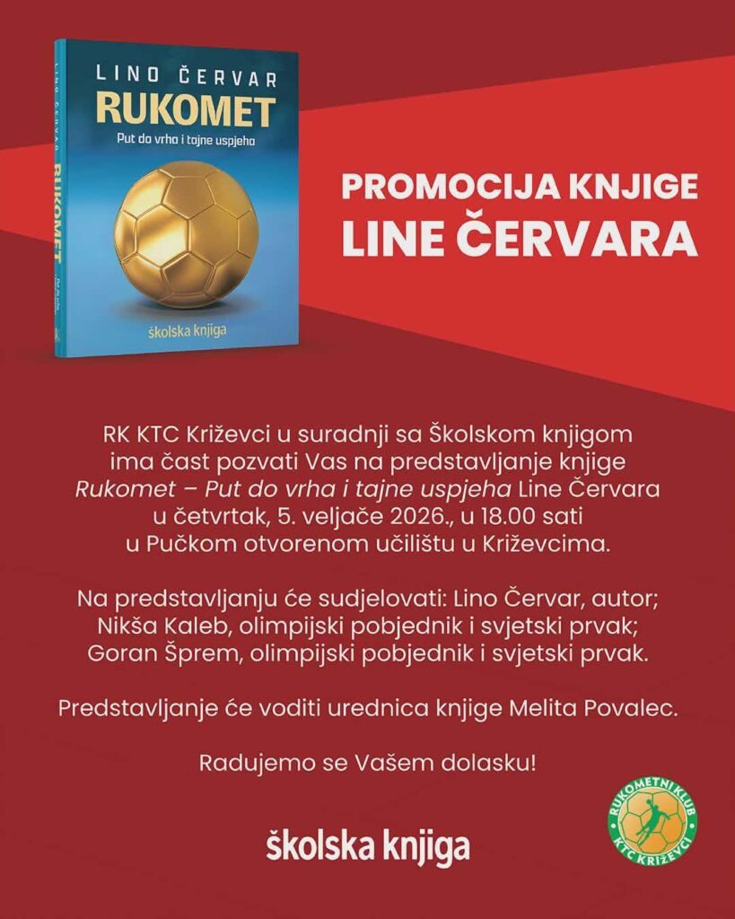 U Križevcima će se u četvrtak, 5. veljače 2026. godine, održati promocija knjige „Rukomet – Put do vrha i tajne uspjeha“ autora Line Červara. Događaj će se održati u Velikoj dvorani Hrvatskoga doma s početkom u 18 sati.
