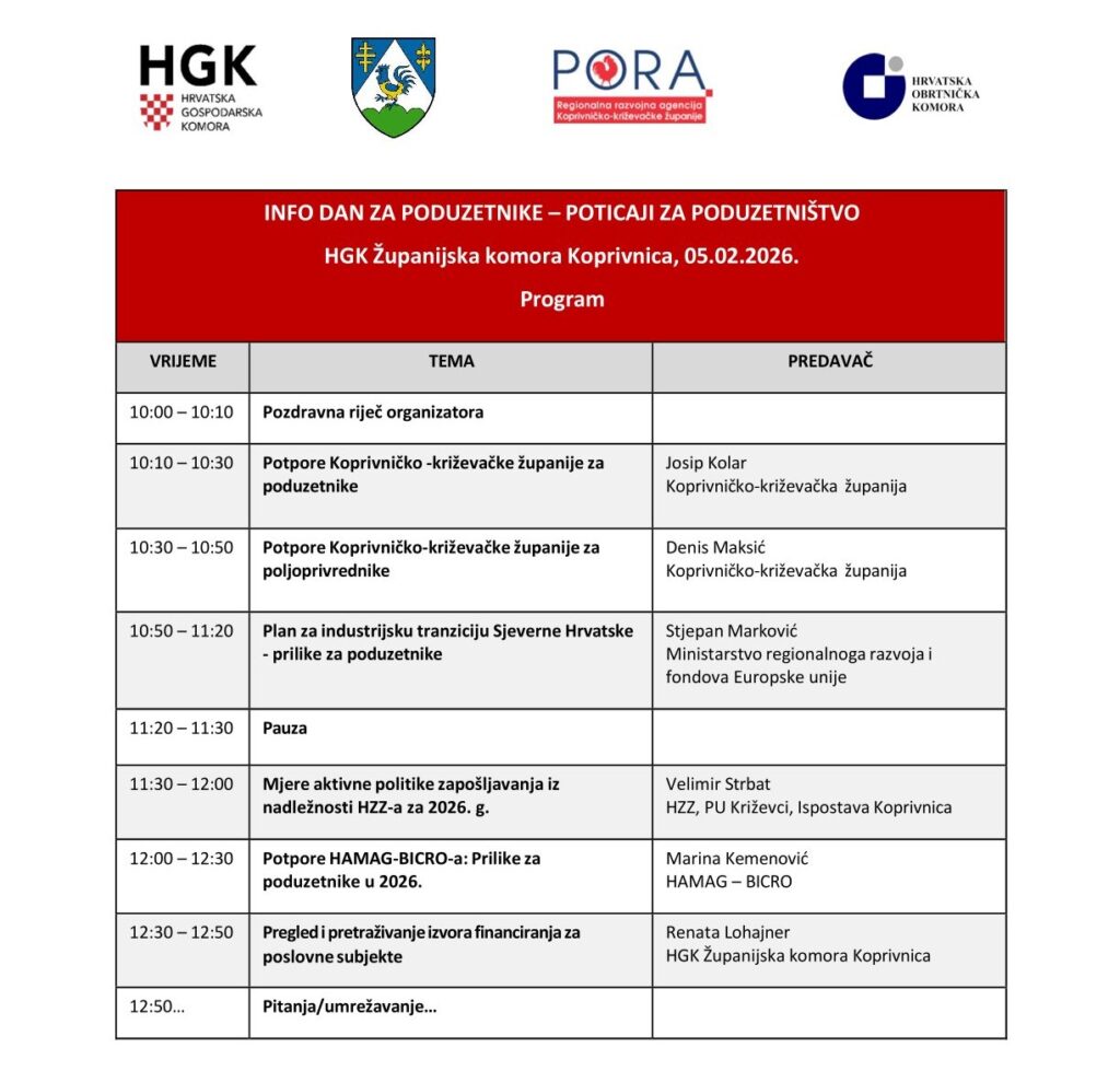 Poseban interes očekuje se i za izlaganje HAMAG-BICRO-a, Marina Kemenović govorit će o aktualnim i nadolazećim programima potpore za poduzetnike u 2026. godini. Program se nastavlja pregledom i savjetima o pretraživanju izvora financiranja, koje će predstaviti Renata Lohajner iz HGK Županijske komore Koprivnica.