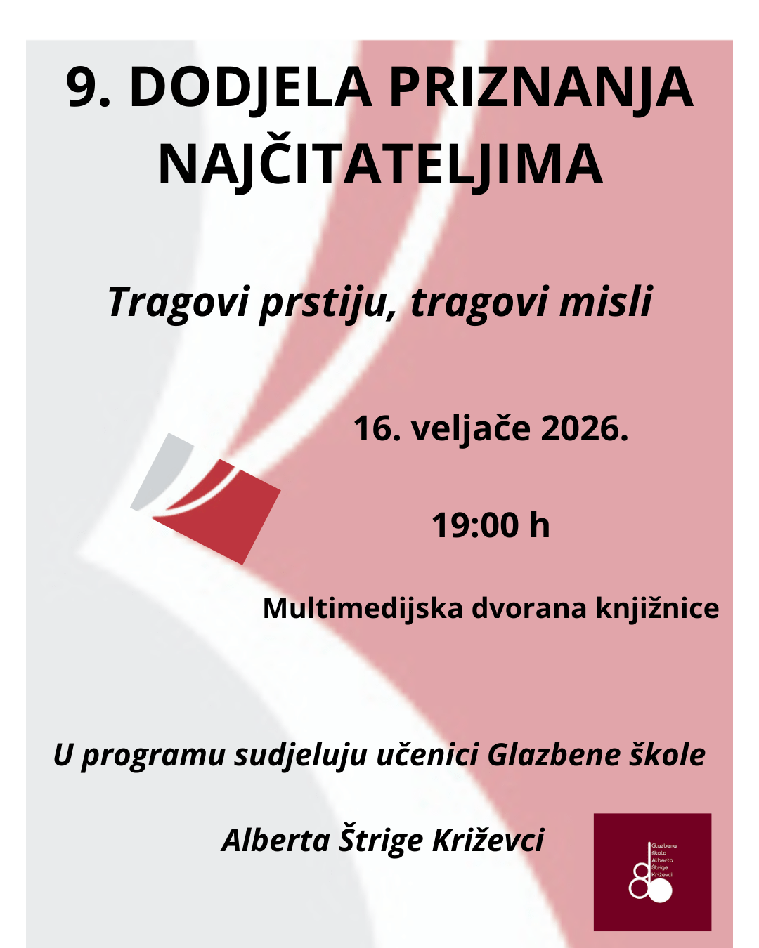 Gradska knjižnica “Franjo Marković” Križevci večeras će u multimedijskoj dvorani knjižnice s početkom u 19 sati upriličiti dodjelu priznanja najčitateljima “Tragovi prstiju, tragovi misli”. Na ovaj način knjižnica vrednuje svoje najaktivnije čitatelje te simbolično nagrađuje dobru naviku čitanja.