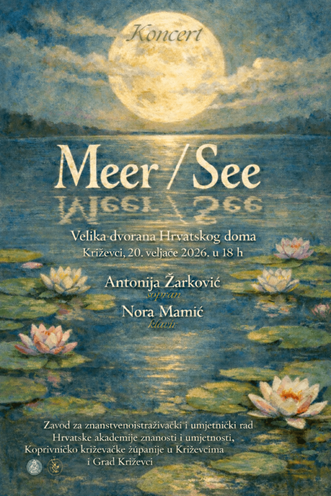 Zavod za znanstvenoistraživački i umjetnički rad u Koprivničko-križevačkoj županiji s osobitim zadovoljstvom poziva građane na koncert pod nazivom „Meer/See (More/Jezero)”, koji će se održati u petak, 20. veljače 2026. godine s početkom u 18:00 sati u Velikoj dvorani Hrvatskog doma. Ovaj glazbeni događaj donosi zanimljiv i tematski zaokružen program, istražujući simboličke, emocionalne i zvukovne dimenzije kroz klasični repertoar.