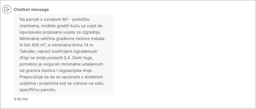 Kod pilotiranja te usluge, za vrijeme prethodne gradske administracije na čelu s Marijom Rajnom, osim što je bio dostupan 0-24 sata, mogao se integrirati s postojećim geografskim informacijskim sustavom (GIS) za pregled prostornih i komunalnih podataka, implementirati kao live chat na gradskoj internetskoj stranici te lako ažurirati u slučaju izmjena Generalnog urbanističkog plana.