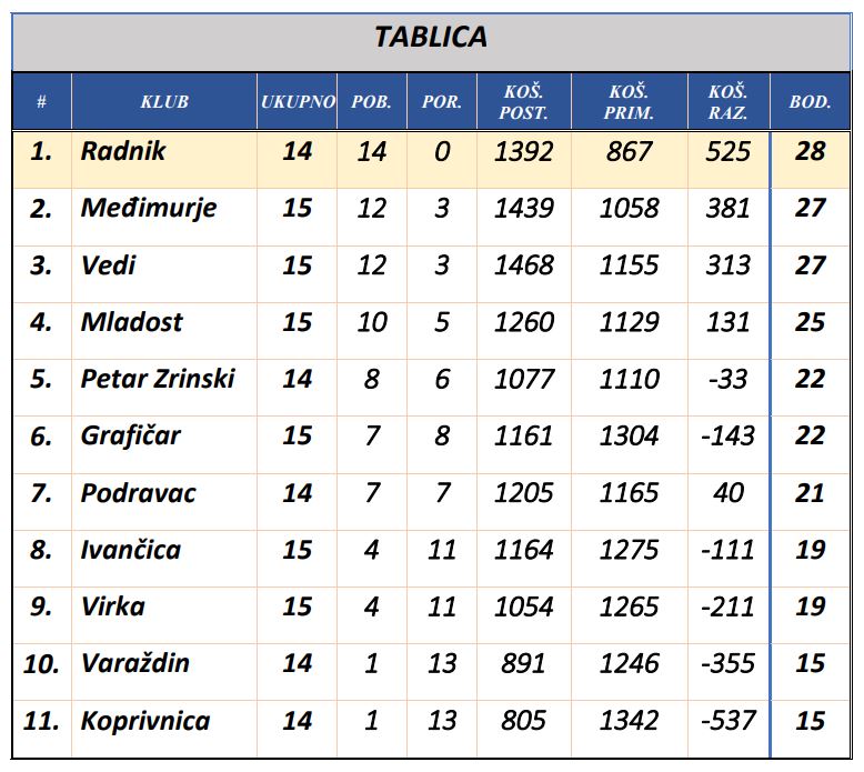 U sljedećem kolu Radnik očekuje feliki derbi protiv bjelovarskog Vedija, koji je s 12 pobjeda i tri poraza izjednačen na drugom mjestu s Međimurjem. Utakmica se igra u subotu 28. veljače s početkom u 16 sati u Dvorani OŠ Ljudevita Modeca u Potočkoj ulici.