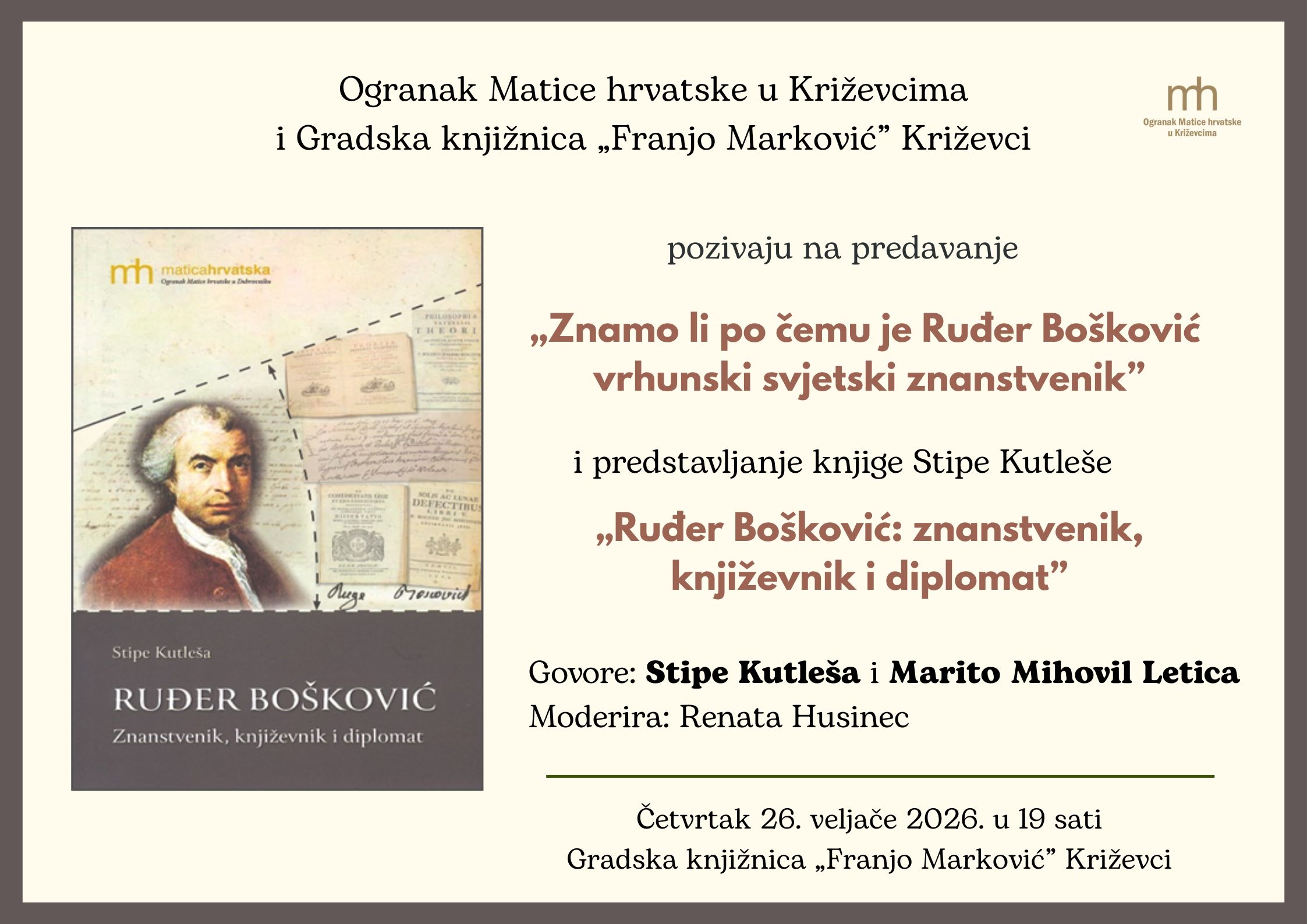 Ogranak Matice hrvatske u Križevcima i Gradska knjižnica “Franjo Marković” Križevci pozivaju na predavanje “Znamo li po čemu je Ruđer Bošković vrhunski svjetski znanstvenik” i predstavljanje knjige Stipe Kutleše Ruđer Bošković: znanstvenik, književnik i diplomat koje će se održati večeras u Gradskoj knjižnici “Franjo Marković” Križevci.