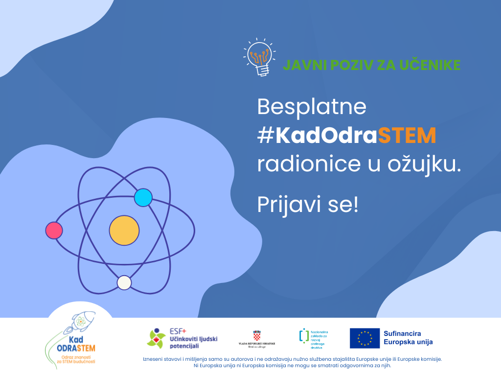 Nakon vrlo posjećenih radionica u veljači, ovaj se mjesec nastavlja s besplatnim #KadOdraSTEM radionicama za učenike koji žele razvijati STEM vještine, istraživački pristup i kreativnost praktičnim aktivnostima. U nastavku donosimo sve o terminima, lokacijama, edukatorima i temama radionica.