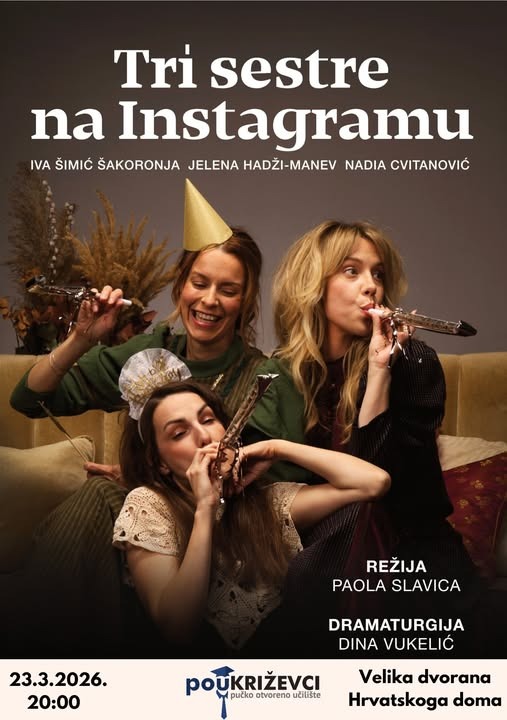 Povodom Dana grada Križevaca, ali u nešto ranijem terminu, Pučko otvoreno učilište Križevci poklanja svojim sugrađanima predstavu Tri sestre na Instagramu koja je nastala u produkciji Kazališne družine Tragači! Ova interpretacija Čehovljeva klasika premješta protagonistice (Iva Šimić Šakoronja, Jelena Hadži-Manev, Nadia Cvitanović/Petra Kurtela) iz ruske provincije u današnju digitalnu svakodnevnicu.