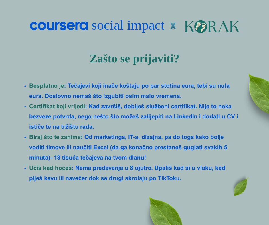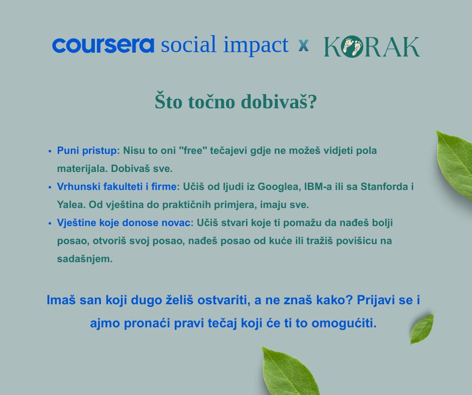 Objavom na društvenim mrežama, Udruga KORAK podijelila je s javnošću vijest o dodjeli 300 besplatnih Coursera licenci, koje su osigurali zahvaljujući Social Impact partnerstvu s platformom Coursera. Navedene licence omogućuju stjecanje certifikata kompanija poput Googlea, Mete, IBM-a te mnogih svjetski poznatih sveučilišta i organizacija.