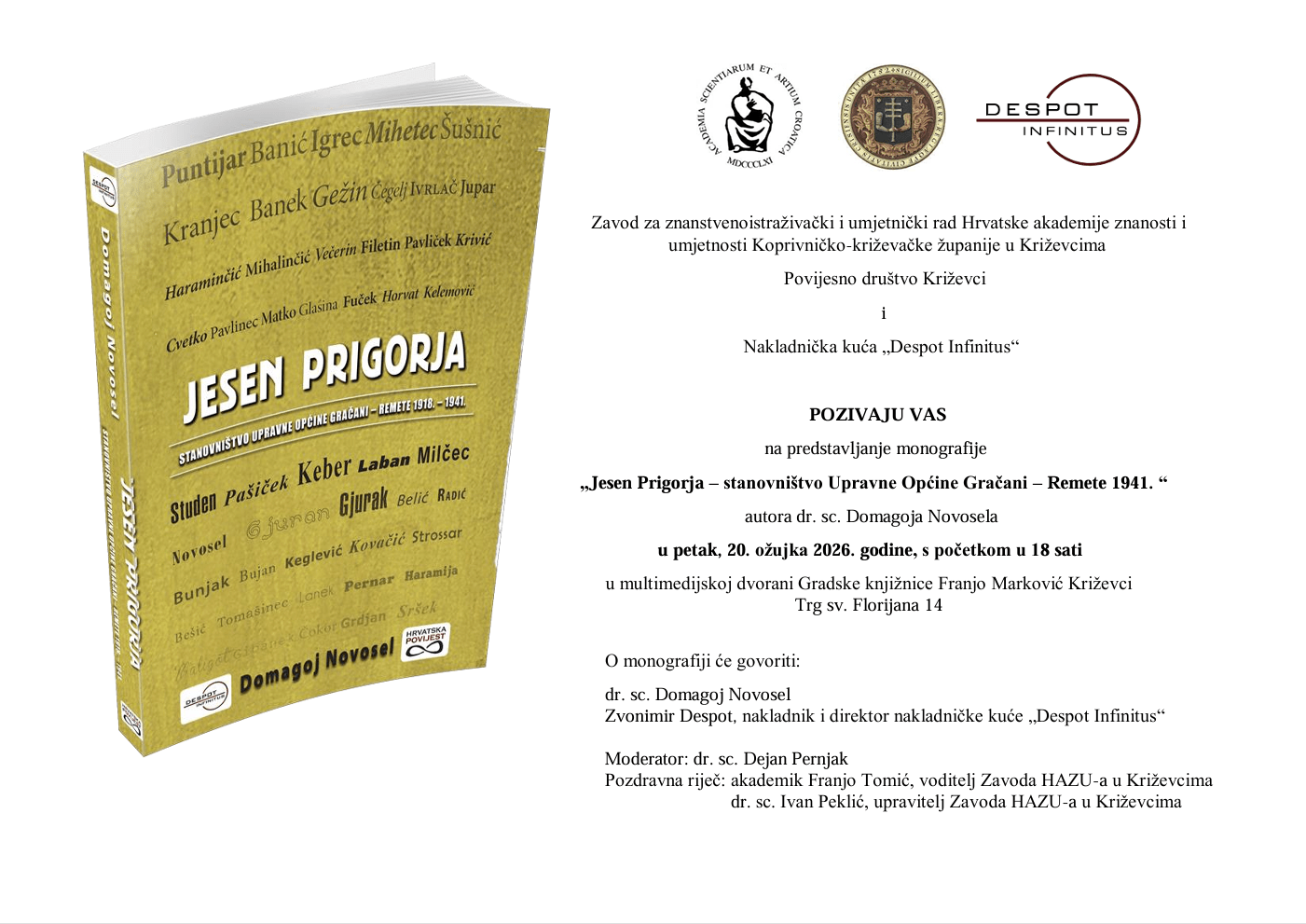 Zavod za znanstvenoistraživački i umjetnički rad Hrvatske akademije znanosti i umjetnosti Koprivničko-križevačke županije u Križevcima, Povijesno društvo Križevci i Nakladnička kuća “Despot Infinitus” pozivaju na predstavljanje monografije “Jesen Prigorja – stanovništvo Upravne Općine Gračani – Remete 1941.” autora dr. sc. Domagoja Novosela.