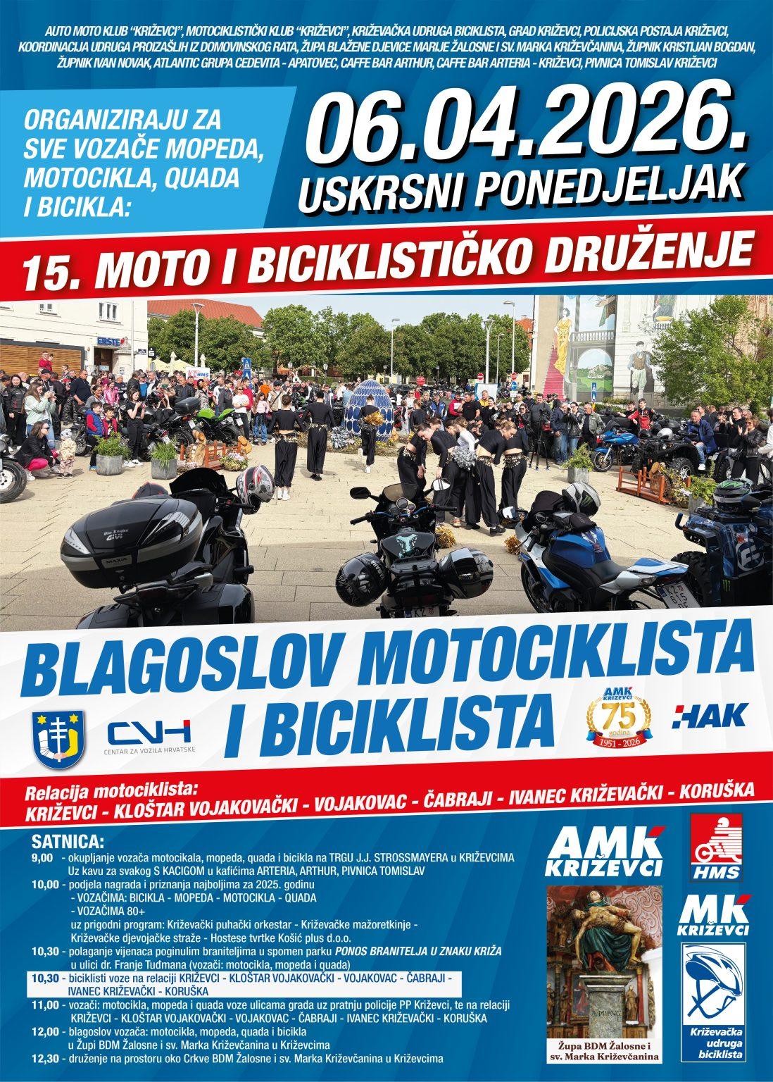Na Uskrsni ponedjeljak već tradicionalno održat će se Moto i biciklističko druženje, i to u 15. izdanju. Organizatori na ovaj događaj pozivaju motocikliste, mopediste, vozače quadova i bicikliste – sudionici će voziti već unaprijed zacrtanom trasom.
