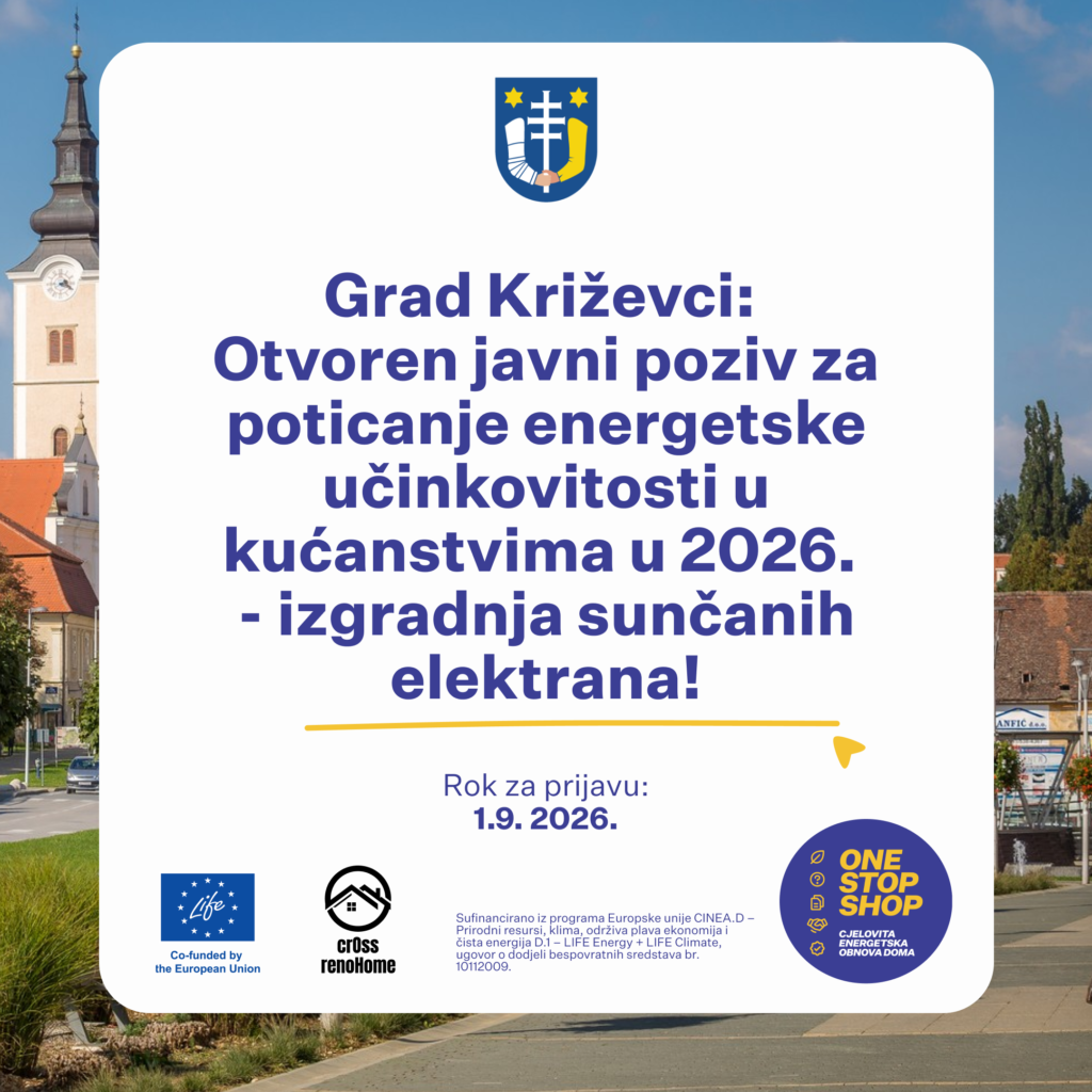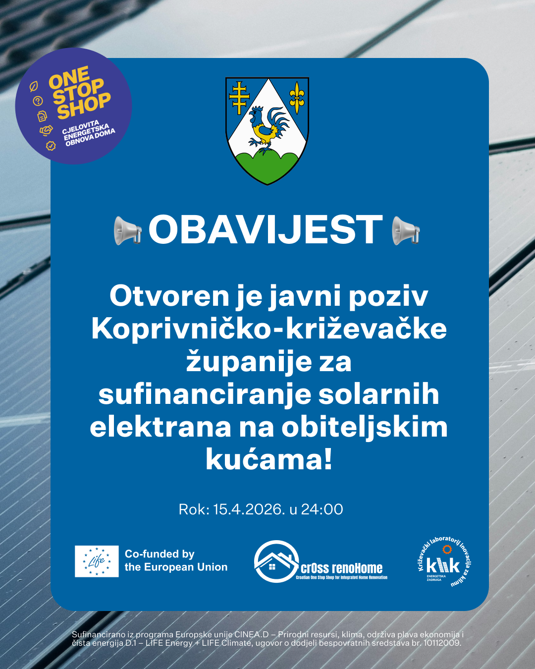 Grad Križevci otvorio je prijave za subvenciju sunčanih elektrana izgrađenih u 2026. godini! KLIK vam pomaže prikupiti dokumentaciju i napraviti prijavu. Detalje javnog poziva pronađite ovdje. Koprivničko-križevačka županija također je objavila javni poziv za sufinanciranje solarnih elektrana na obiteljskim kućama koje su ugrađene i puštene u pogon od 2. siječnja 2026. pa do kraja godine. Važno je samo da se prijava napravi do roka: 15. 4. 2026. Javni poziv namijenjen je svim građanima Koprivničko-križevačke županije. Sve informacije o natječaju možete pronaći ovdje.