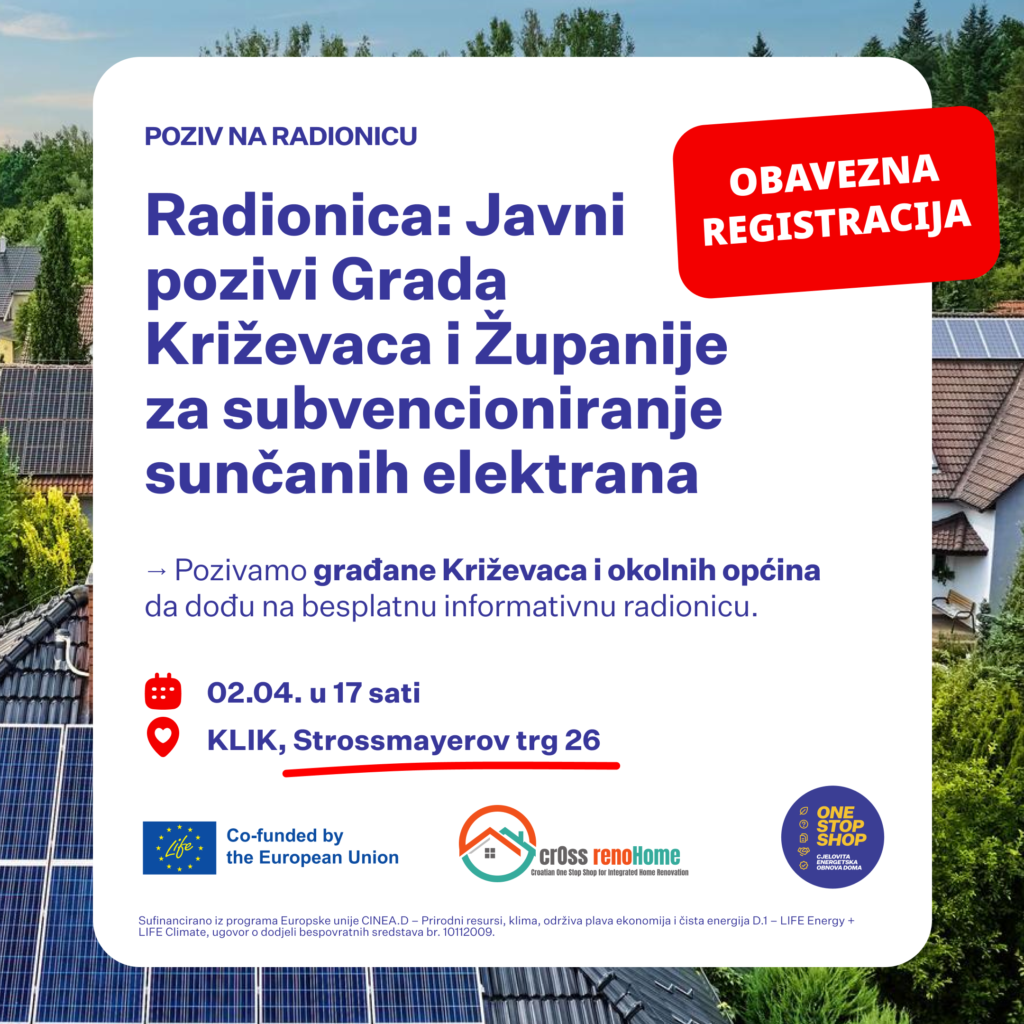 Ako u 2026. godini gradite sunčanu elektranu i planirate se prijaviti za subvenciju – dođite na radionicu u 2. 4. u 17 sati. Predstavit ćemo dva otvorena javna poziva: Poziv Koprivničko-križevačke županije (otvoren za sve stanovnike Županije), Poziv Grada Križevaca (otvoren za stanovnike Grada i Općine Križevci). – Poručuju organizatori iz energetske zadruge KLIK.