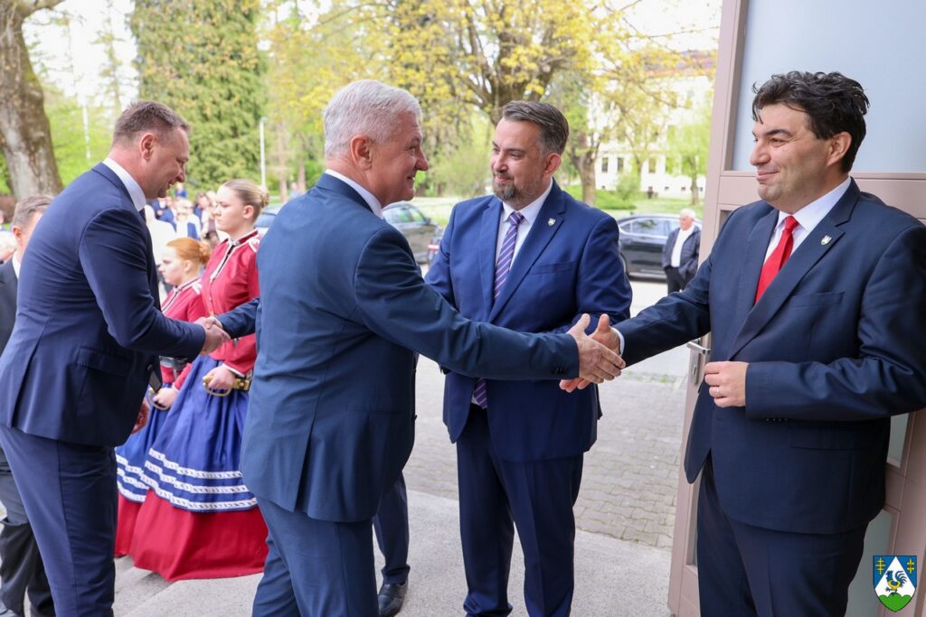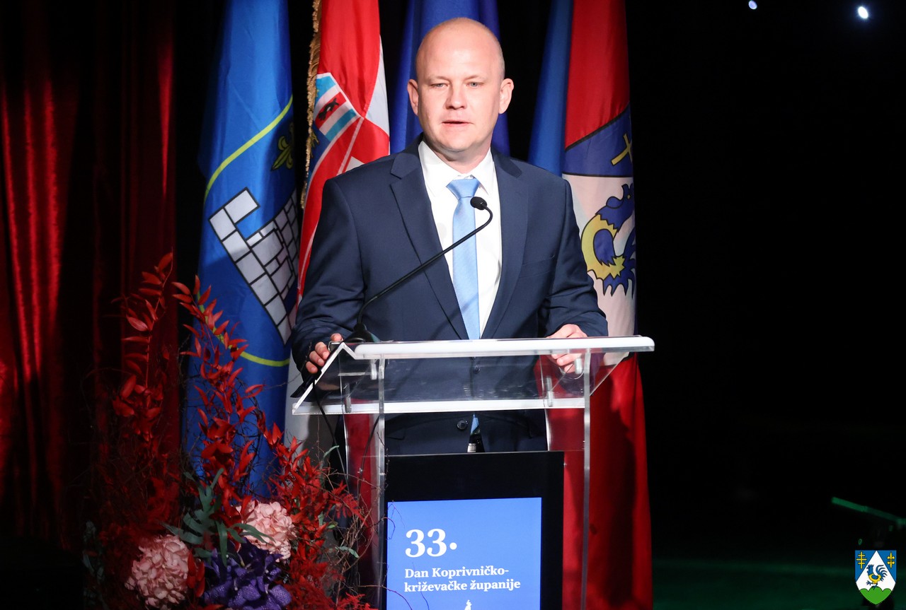 Uime prisutnih predstavnika jedinica lokalne i regionalne samouprave, prigodnim se govorom obratio potpredsjednik Hrvatskog sabora i gradonačelnik Koprivnice Mišel Jakšić te poručio: „Iscurila nam je kao pijesak kroz prste još jedna godina, godina koja je bila izborna i nosila je u sebi promjene, međutim isto tako ovo je bila godina koja je u potpunosti promijenila svijet i živote koje smo gradili u njemu. Imamo prilike gledati ogroman tehnološki napredak, svemirske letjelice oblijeću mjesec, roboti sudjeluju u najsloženijim medicinskim zahvatima, umjetna inteligencija nam daje odgovore na brojna pitanja i jednadžbe. I sad dolazimo do onoga gdje smo tu mi, Podravina i Prigorje? Realno, premaleni smo da bi okrenuli svjetske tokove, premalena je i cijela Hrvatska, zapravo je pitanje što može i EU. U tim promjenama svijeta kretala je poljoprivreda koja je donijela snažnu industriju i gospodarstvo, razvijao se društveni, kulturni, sportski život, stvoren je kraj kojem dugujemo jednu veliku predanost i jedan veliki ponos. Zato sam siguran, da u jednoj snažnoj pozitivnoj energiji, koliko god bilo teško, zamršeno, Podravina i Prigorje će opet ići snažno naprijed. Kroz gradnju ceste, pruge, vraćanje naše poljoprivrede, razvoj turizma jer imamo bogomdan prostor za to, i ono najvažnije kroz ulaganja za bolje uvjete i život naših učenika i umirovljenika. Jer to je solidarnost, to je srce. Sretan vam rođendan Koprivničko križevačke županije.“