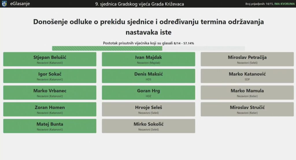 Potpredsjednik Gradskog vijeća Marko Vrbanec, koji je preuzeo vođenje sjednice, koji je na glasovanje dao najprije skidanje točke o Majdakovoj smjeni s dnevnog eda, a zatim i uvrštavanje točke o izboru predsjednika Gradskog vijeća. Potom je napravio pauzu sjednice kako bi sazvao Odbor za izbor i imenovanja i razmotri prijedlog vladajuće većine o Hrgovoj kandidaturi. Po povratku je predložio privremeno zaustavljanje sjednice i nastavak u subotu, 18. travnja 2026. u 12:00 sati, što je glasovanjem vladajuća većina podržala s 8 glasova, a oporba nije glasovala, ako je suditi po informacijama s ekrana elektroničkog sustava za vođenje sjednice, već je napustila dvoranu. Nastavak sjednice Gradskog vijeća s jedinom točkom izbora novog predsjednika Gradskog vijeća očekuje se sutra točno u podne.