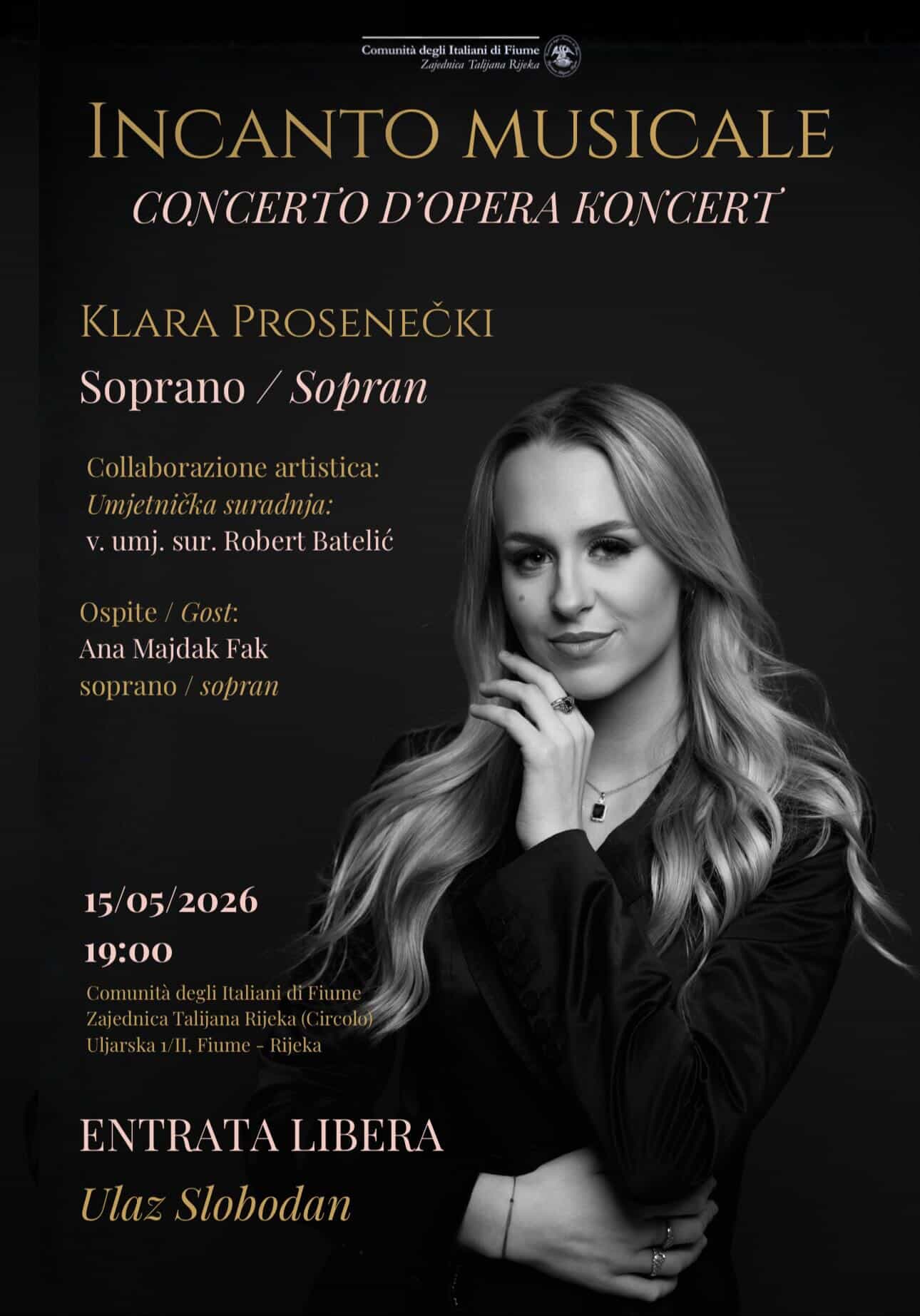 Križevčanka Klara Prosenečki, studentica 1. godine solo pjevanja na Akademiji za umjetnost i kulturu u Osijeku u klasi prof. art. dr. sc. Berislava Jerkovića, održat će koncert u organizaciji Zajednice Talijana Rijeka. Koncert će se održati 15. svibnja u 19 sati u dvorani Circolo (Palazzo Modello). Koncert se organizira povodom uspjeha na natjecanju Lions Grand Prix, gdje je prošle godine osvojila nagradu za najbolju interpretaciju talijanskog autora, kao i nagradu za izvedbu u koncertnoj dvorani.