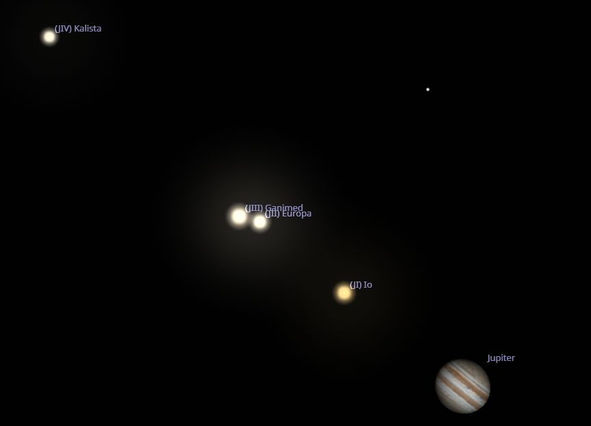 Prikaz Jupitera i njegovih satelita kako će biti raspoređeni večeras, generiran u programu Stellarium (open‑source planetarij)
